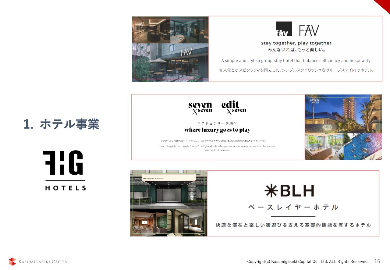 ホテル事業については、「fav(ファブ)」「seven x seven(セブンバイセブン)」「BASE LAYER HOTEL(ベースレイヤーホテル)」の3つのブランドを軸に展開しています。