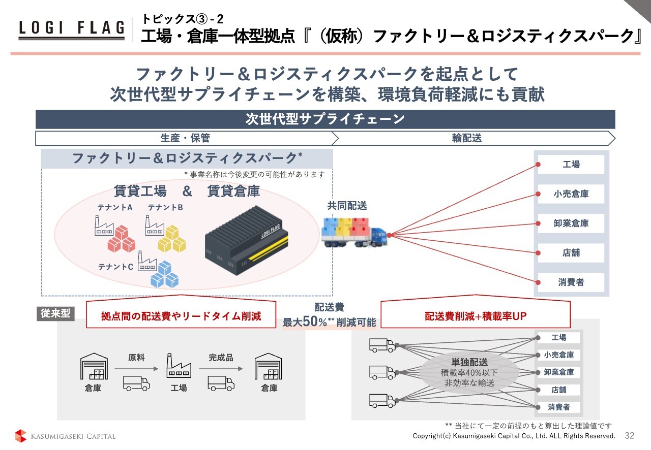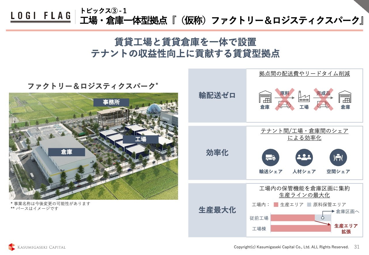 続いて種まきの2つ目です。仮称「ファクトリー&ロジスティクスパーク」という名のもとに、物流施設を核とした賃貸工場併設型の複合開発を推進していく取り組みです。これによって期待されるのは、効率化が非常に大きな要素であると考えています。