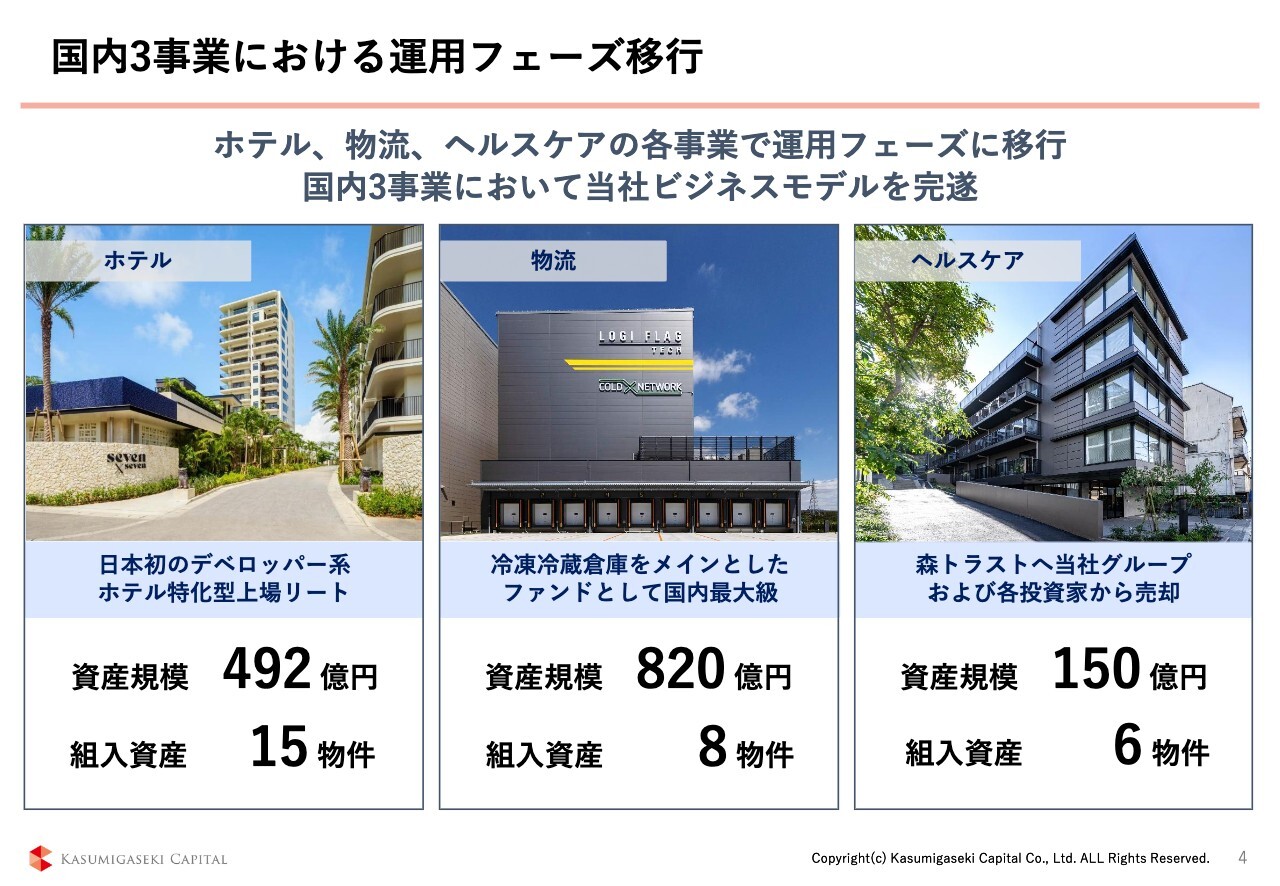 2つ目として、ホテルのJ-REIT、物流施設の私募ファンド、ヘルスケア施設の私募ファンドを合計で1,500億円規模で組成しました。当社のビジネスモデルは、第1フェーズでは土地を取得し計画を策定、第2フェーズでは開発ファンドを活用して建物を建設し、第3フェーズで完成した物件を中長期運用型の安定ファンドに移して運用するというものです。