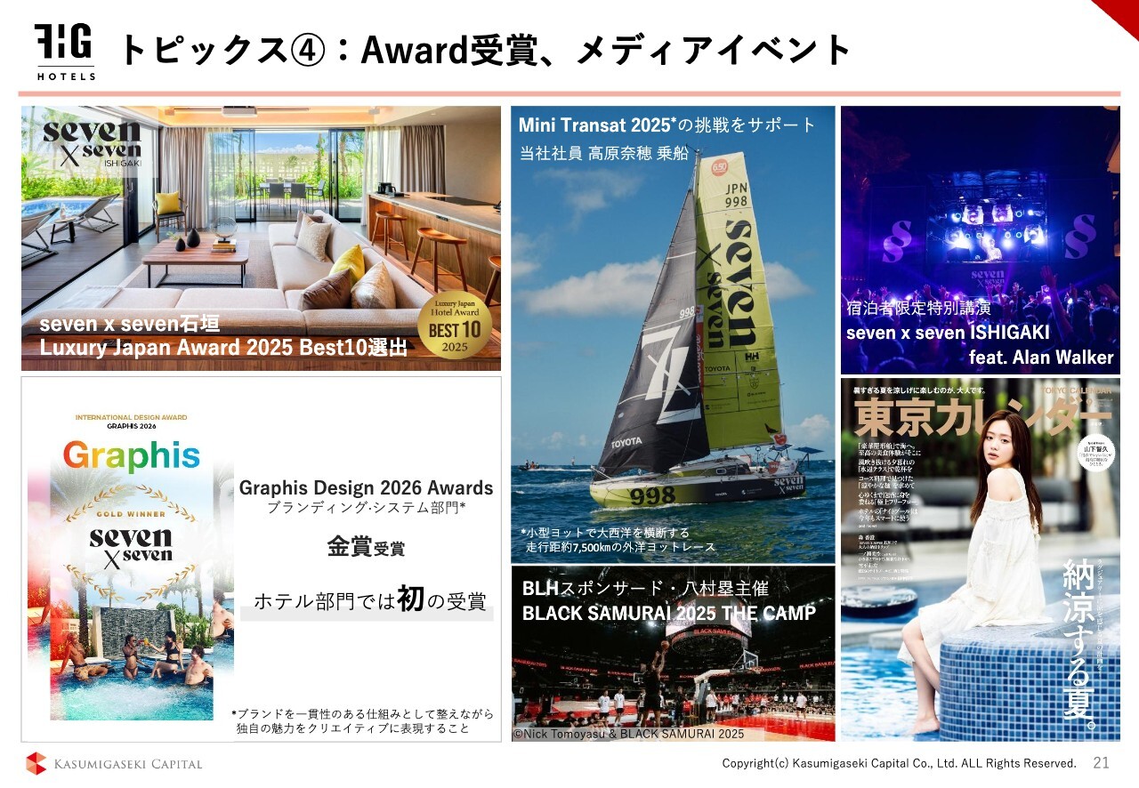 アワードとメディアについてです。アワードについては、上期に「seven x seven 石垣」が「Luxury Japan Award 2025」のトップ10に選出されました。これは、日本の代表的なホテル、例えばパレスホテル東京さま、ブルガリホテル東京さま、アマン東京さまといったブランドと肩を並べて、当社の石垣のホテルがトップ10に選出されたもので、非常に誇らしく思っています。