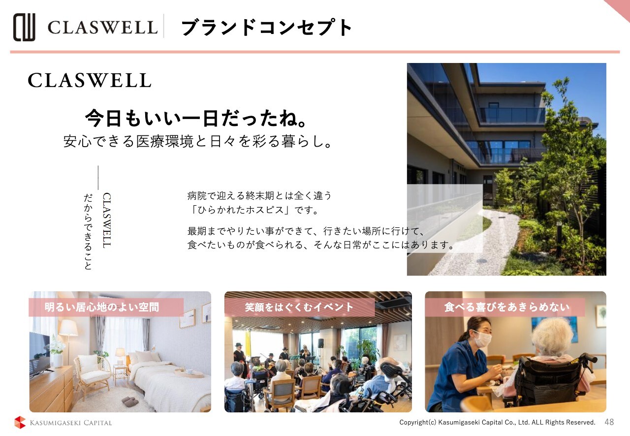 スライドでは、当社が手掛けるホスピスのコンセプトについてお話しします。「CLASWELL」という名称で展開しており、「いい暮らしを送っていただきたい」という思いを込めています。平たく言えば、自分の親を入居させたいと思えるような施設を作ろうという思いが込められています。