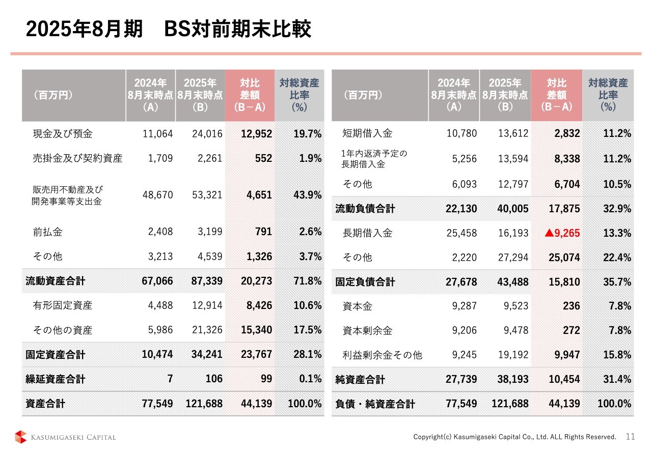 当社は開発ファンドの出資持分を保有しているため、売却益を加味した時価評価の投資有価証券として、このバランスシートに計上しています。開発ファンドはSPCを利用していますが、8月末時点ではそのSPCの決算が完了していなかったため、投資有価証券として計上されました。