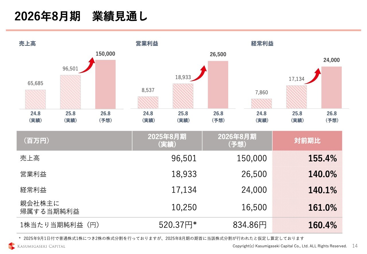 2026年8月期の業績見通しについてご説明します。売上高は1,500億円、営業利益は265億円、経常利益は240億円、そして当期純利益は従来公表の150億円ではなく、165億円としました。