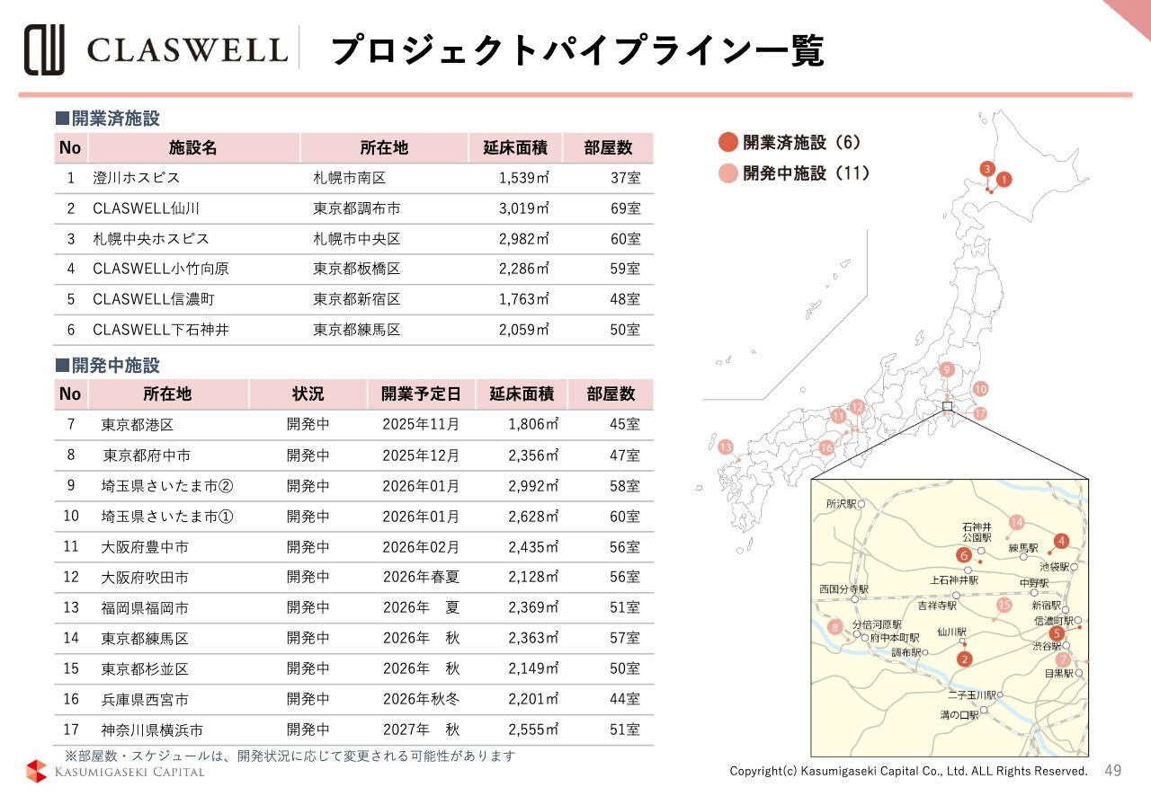 ホスピスのパイプライン一覧をスライドに記載しています。上段の6物件は安定ファンドに組み入れ済みであり、下段の11物件は開発ファンドに含まれる物件です。開発が完了次第、これらも順次、中長期運用の安定ファンドに組み入れる予定です。