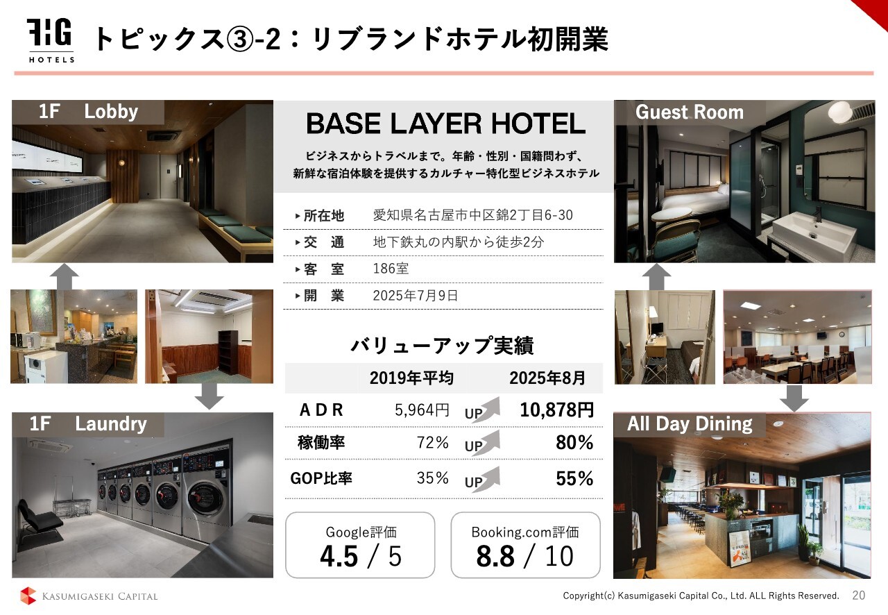また、GOP比率についてですが、もともとホテルでは一般的な水準である35パーセント程度だったGOP比率が、単月の実績では55パーセントとなりました。これは「fav」で培ってきたセルフホスピタリティをBASE LAYER HOTEL事業にも適用することで、高い利益率を確保することができた結果です。これらを組み合わせることで、今回のバリューアップでは倍以上の価値を創出できたと考えています。