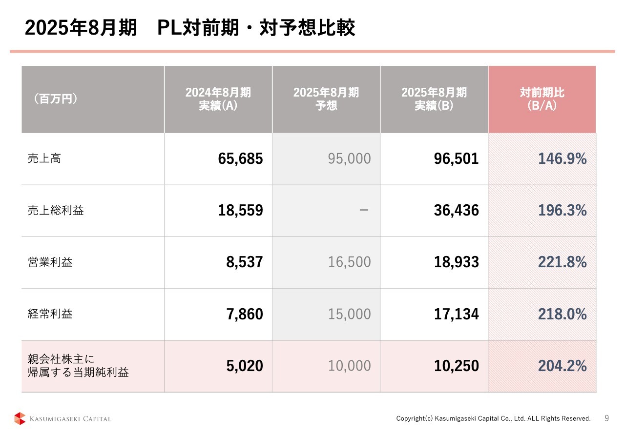 2025年8月期のおさらいです。1つ目は、当期純利益が102億円だった点です。4年前の2021年10月の決算説明会で「5年間で純利益を10倍の100億円にします」とお伝えした際には、懐疑的に思われた方も多かったかもしれませんが、5年ではなく4年で100億円を達成しました。