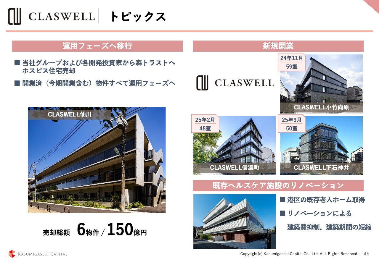 冒頭でもお話ししましたように、ホスピス住宅6物件で150億円の私募ファンドを組成しました。当社が手掛けるホスピス住宅は、建物のクオリティとロケーションのいずれも、一般的なホスピスと比べて高品質なものを提供できていると考えています。
