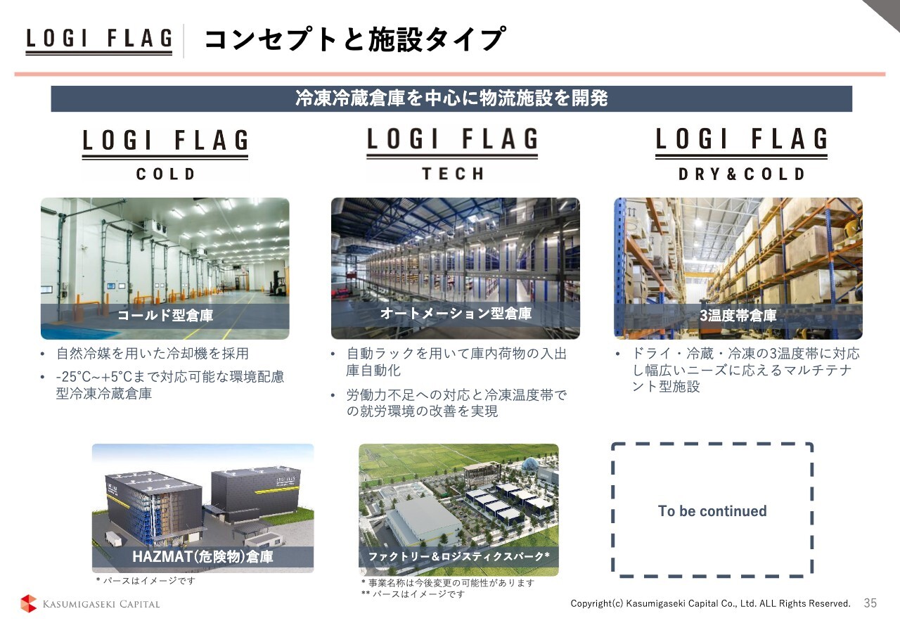 今までは、スライド上段にあるような冷凍自動倉庫や3温度帯の倉庫を作ってきました。それに加え、昨年度はHAZMAT(危険物)倉庫、今年度はファクトリー&ロジスティクスパークなど、さまざまな展開を行ってきています。今後もさまざまな事業に取り組んでいく予定のため、スライドは「To be continued」としています。