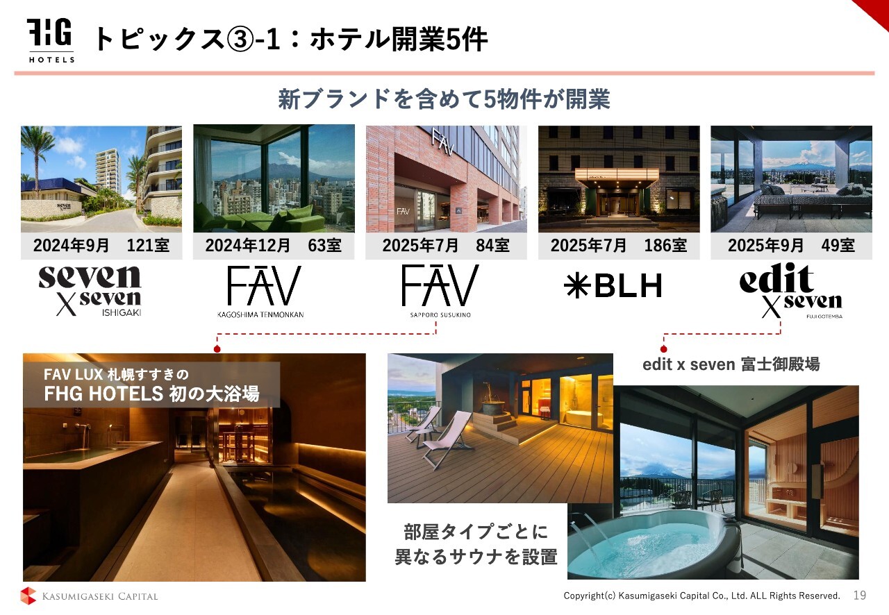 ホテルの開業についてです。2025年8月期は新ブランドを含む5棟が開業しました。特に2025年7月に開業した「FAV LUX(ファブラックス)札幌すすきの」は、「fav」ブランドにおける初の試みとして大浴場を併設したホテルとなっています。