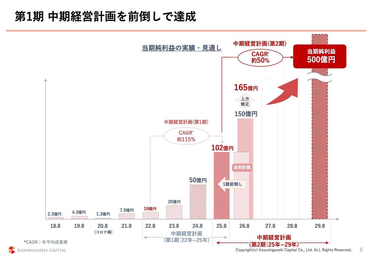 第1期中期経営計画は、期間を1年前倒しした結果、CAGR(年平均成長率)は115パーセントでした。そして、第2期中期経営計画では、2029年8月期に当期純利益500億円を目標に掲げており、それを達成するためのCAGRは50パーセントとなります。この目標に向けて、まずは2026年8月期に当期純利益165億円を確実に達成しようと考えています。