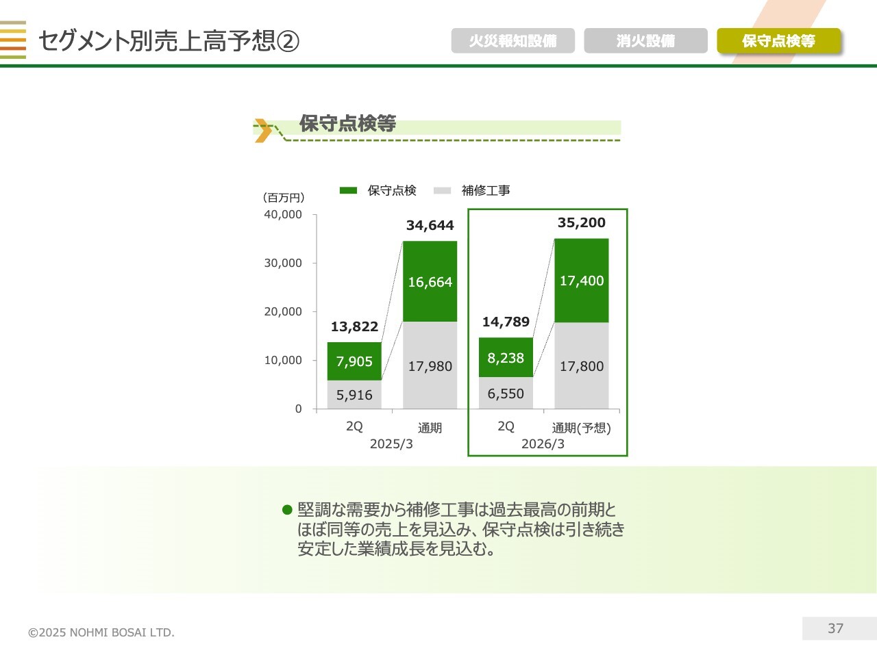 保守点検等セグメントについてです。補修工事では需要が引き続き堅調に推移しており、過去最高だった前期とほぼ同等の売上高を見込んでいます。また、保守点検では新築物件が順調に増加しているため、安定した業績成長が見込めると考えています。