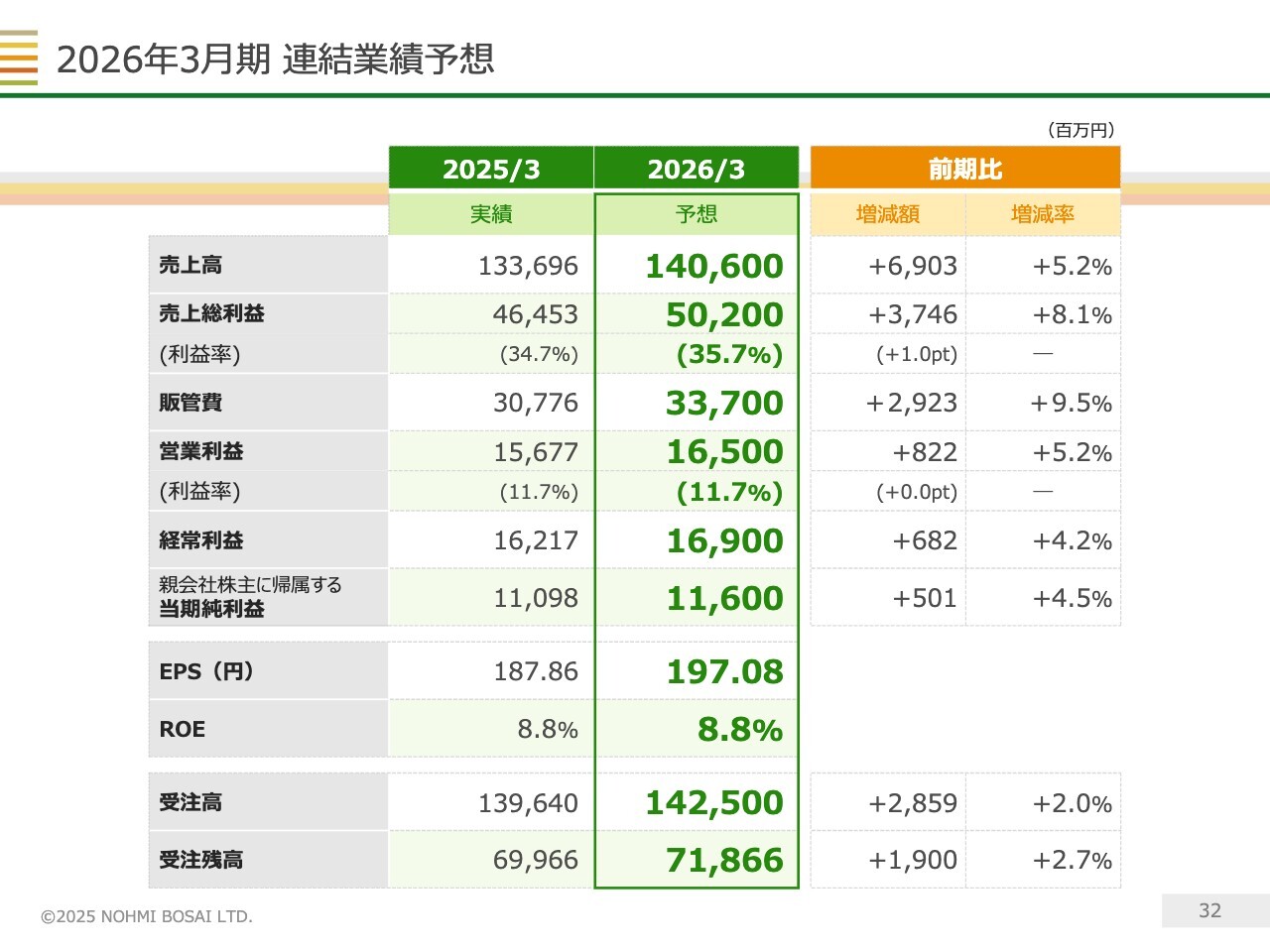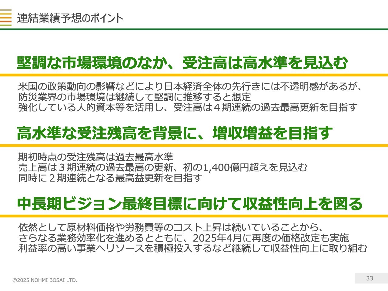 連結業績予想のポイントです。日本経済全体の先行きには不透明感があるものの、防災業界の市場環境は非常に堅調に推移しているため、強化している人的資本をフル活用し、受注高の4期連続過去最高更新を目指していきます。