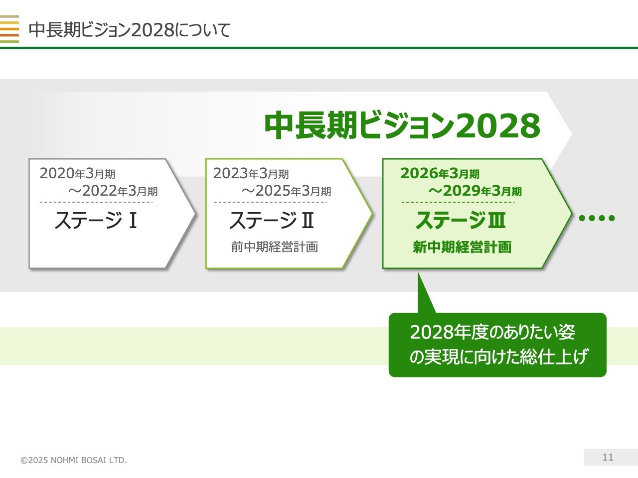 「中長期ビジョン2028」は2028年度までの10年計画であり、ステージⅢは最後の総仕上げに取り組む4年間と位置づけています。