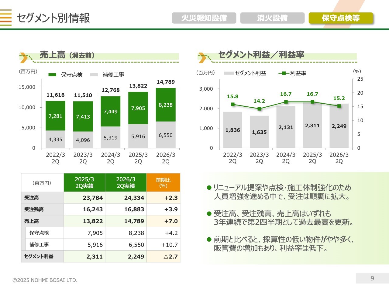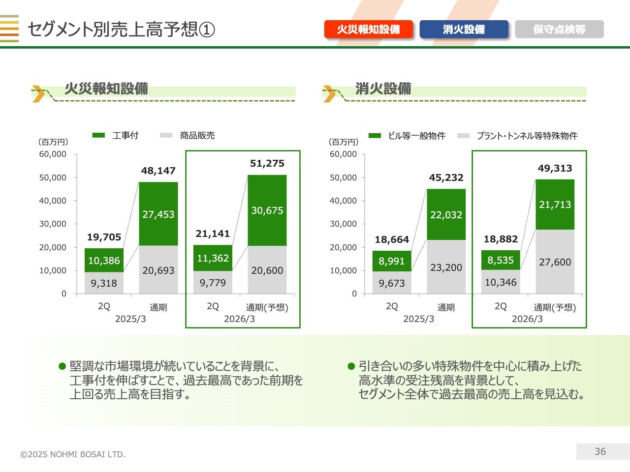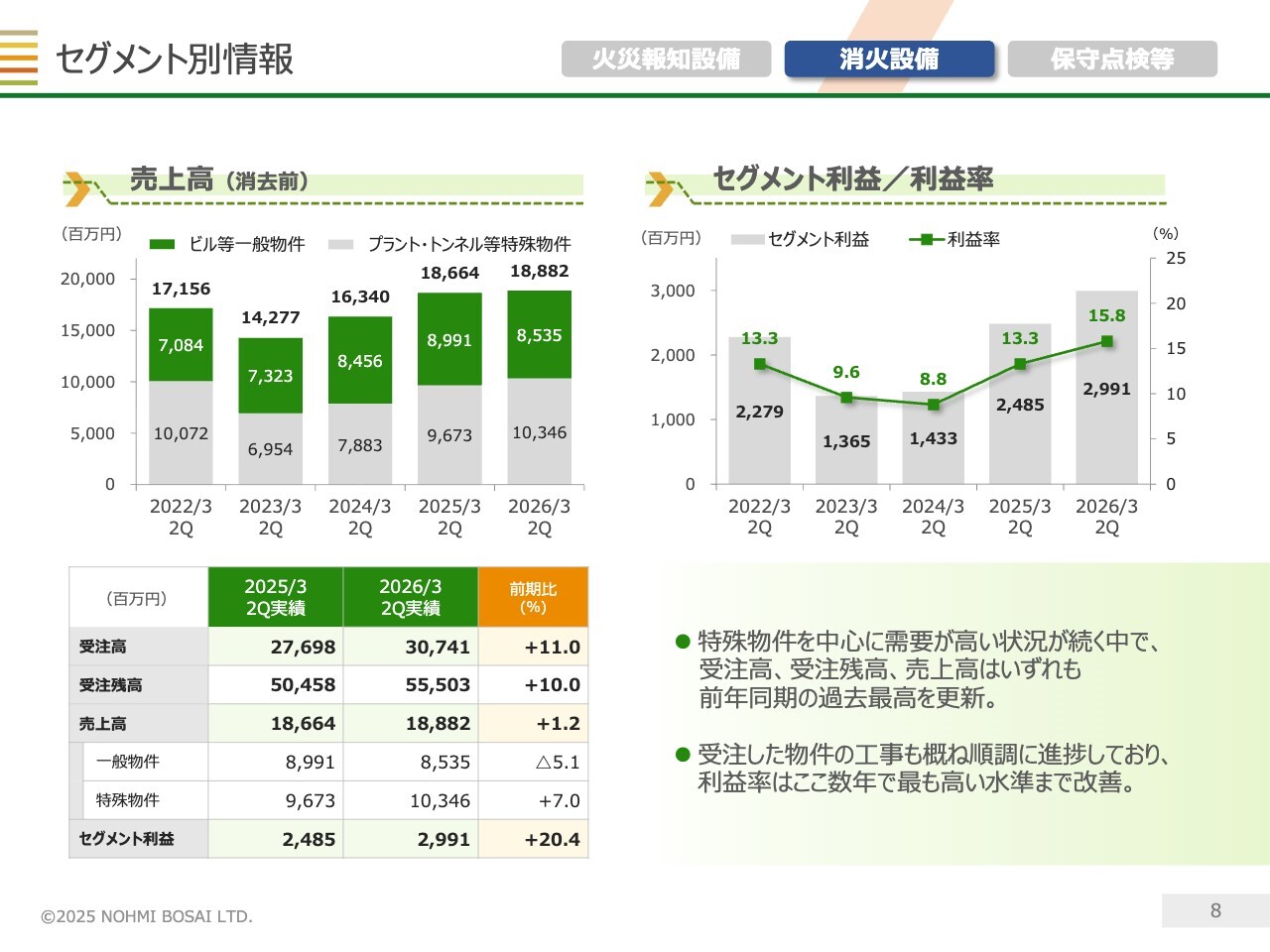 右側の消火設備については、特殊物件の引き合いが多く、受注残高は過去最高水準にあります。これを背景に、セグメント全体の売上高は過去最高だった前期を上回る見込みです。