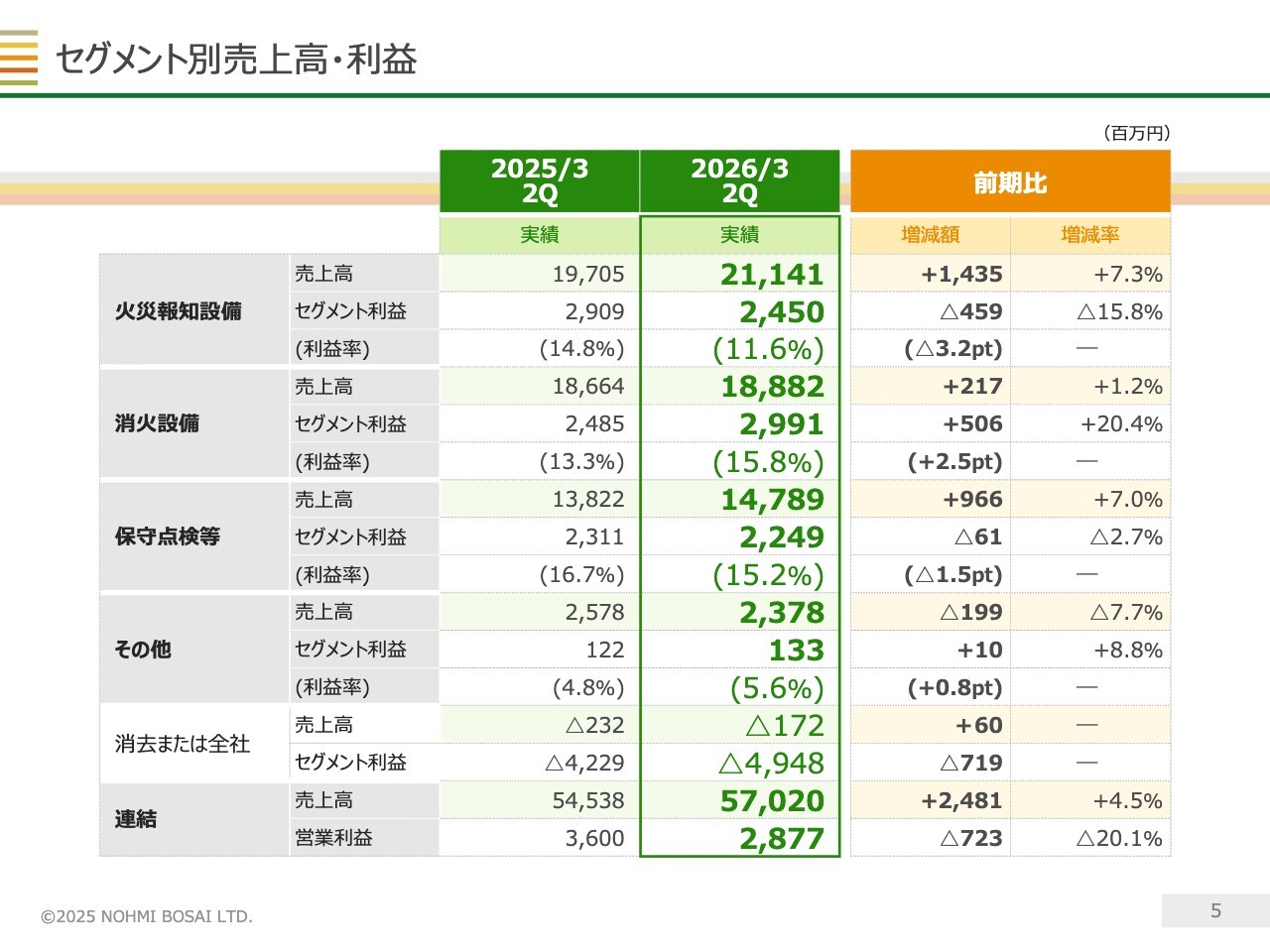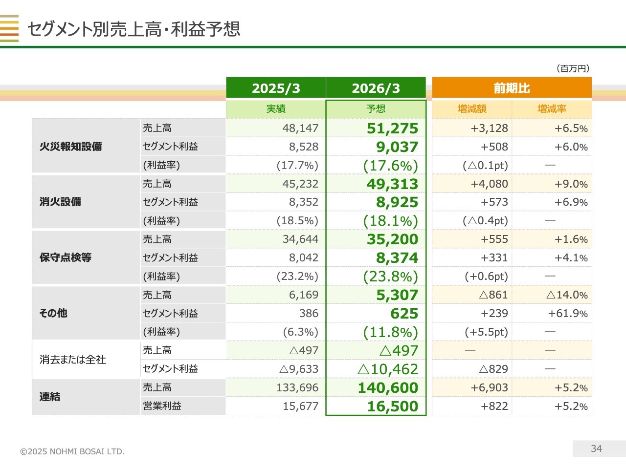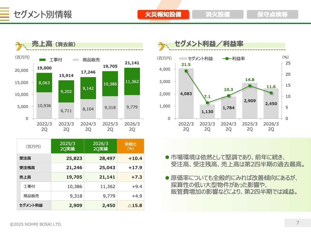 右側の消火設備については、特殊物件の引き合いが多く、受注残高は過去最高水準にあります。これを背景に、セグメント全体の売上高は過去最高だった前期を上回る見込みです。
