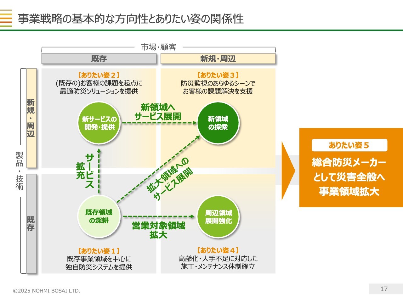 事業戦略の基本的な方向性については、スライドのようなイメージです。既存領域の深耕と同時に新領域の探索を進め、事業領域の拡大を図ることで、「ありたい姿」の実現を目指していく考えです。