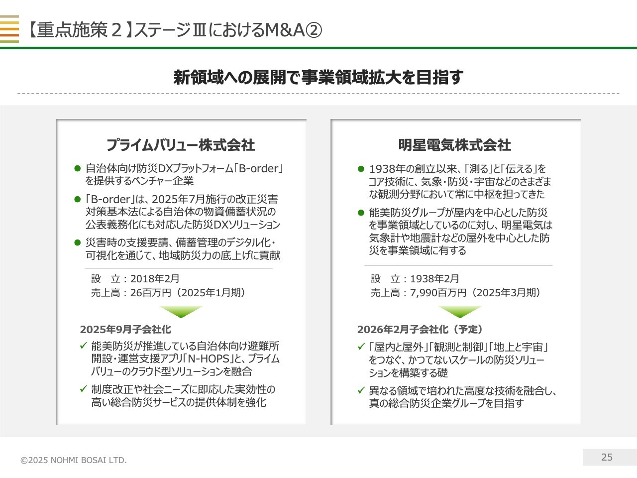 さらに、来年2月には明星電気株式会社がグループ入りする予定です。明星電気社は気象・防災・宇宙といった事業を展開しており、気象計や地震計など、当社とは異なる切り口の防災を事業領域に持つ企業です。