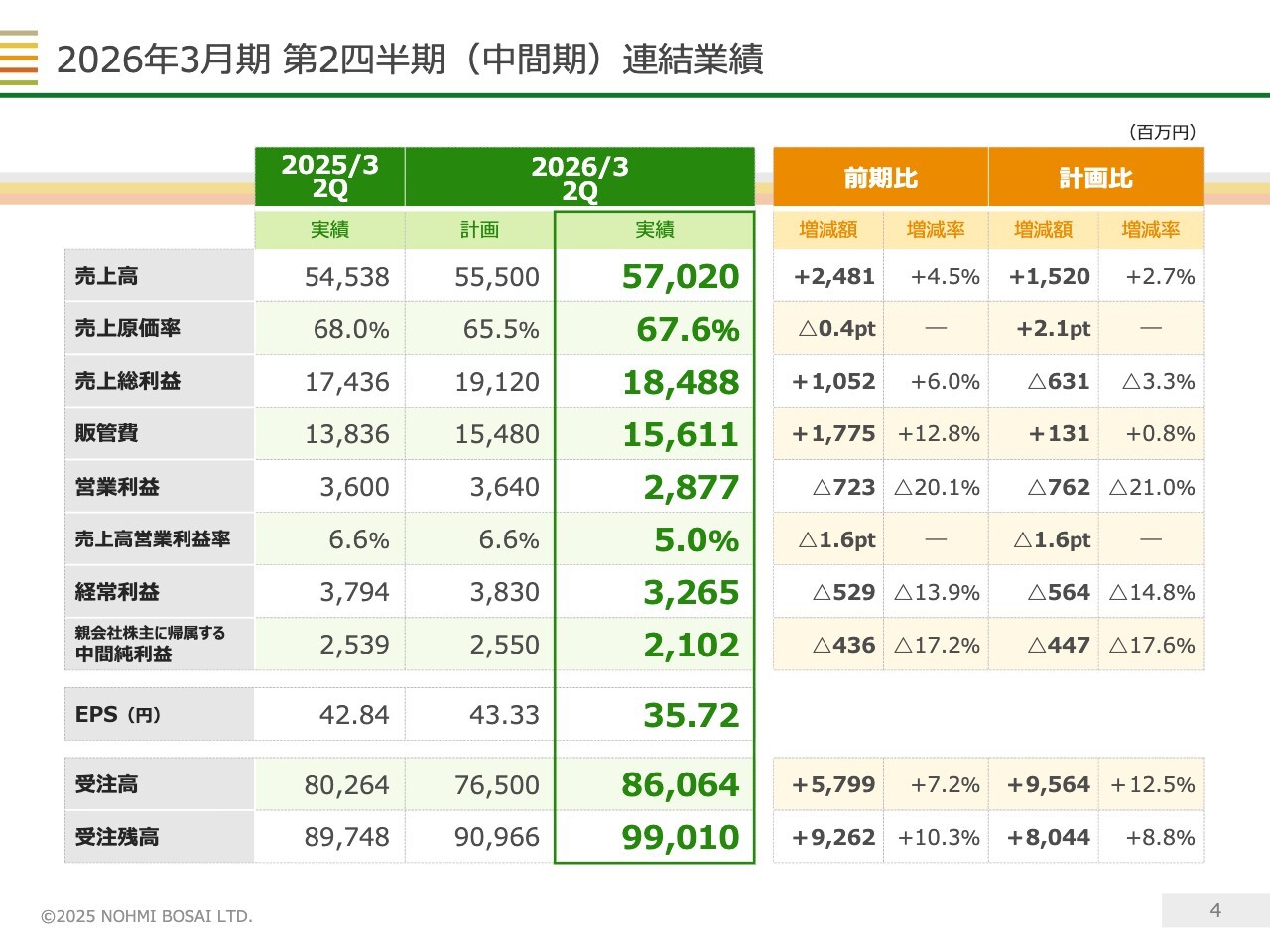 このように、利益面はやや厳しい結果となりましたが、受注高は前期を約58億円上回って過去最高を記録し、受注残高も前期に比べて93億円ほど高い水準となっています。良好な市場環境が続いているため、期末に向けて十分に挽回できる状況にあると考えています。