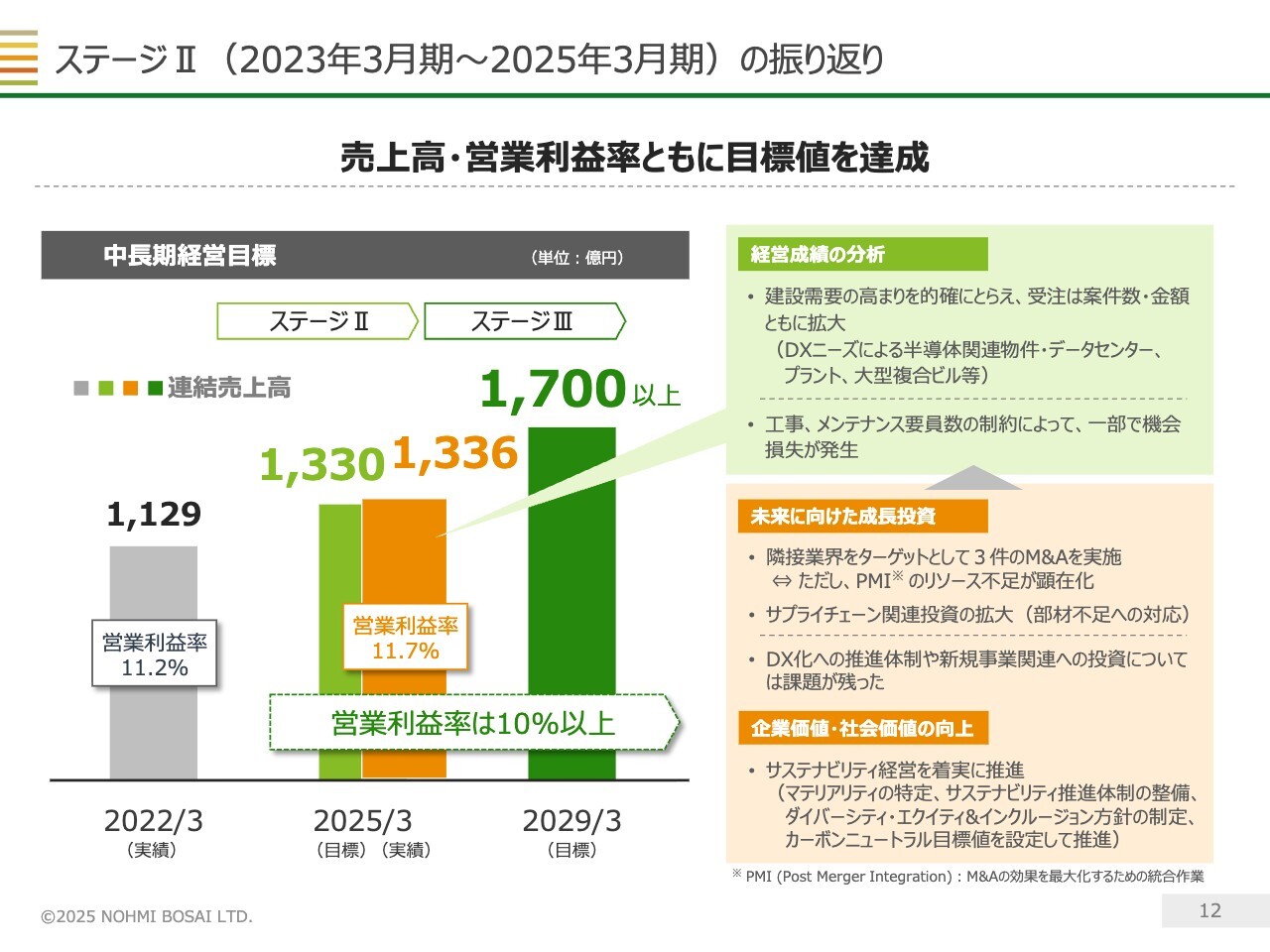 ステージⅡの振り返りを簡単にご紹介します。ステージⅡでは、建設需要の高まりを的確に捉えた結果、業績目標を無事達成することができました。