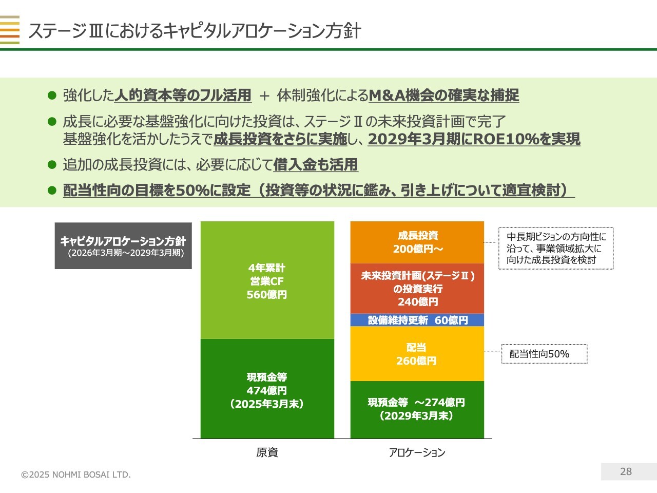 財務戦略については、ステージⅢから新たにキャピタルアロケーション方針を公表しています。営業キャッシュフローと手元の現預金を、成長に向けた投資と株主のみなさまへの還元に積極的に振り向ける方針です。