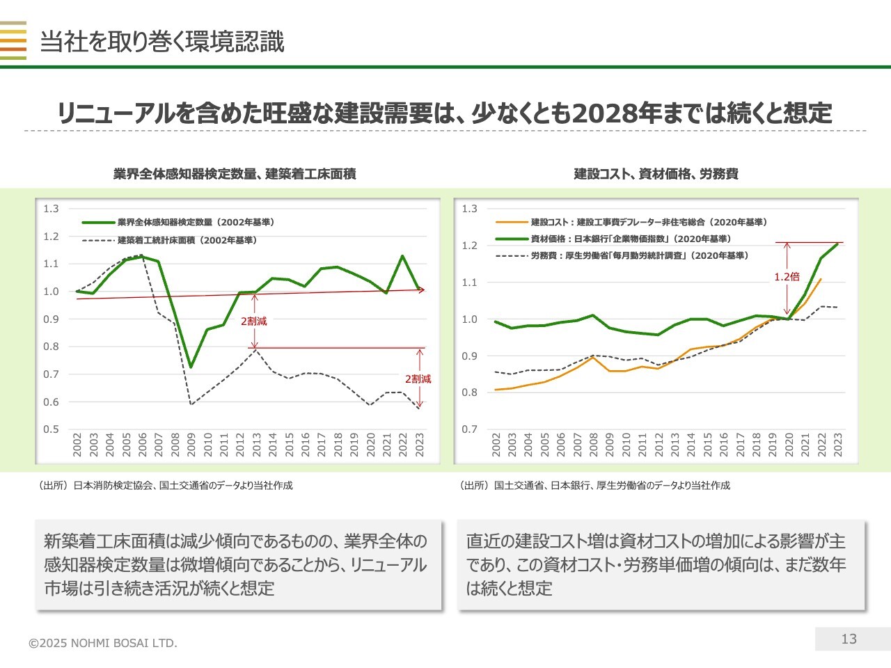 ステージⅢに取り組む上での外部環境の認識についてですが、リニューアルを含めた建設需要は旺盛です。一方で原材料などのコスト増加が懸念されるものの、この堅調な環境は少なくとも2028年まで続くと想定しています。