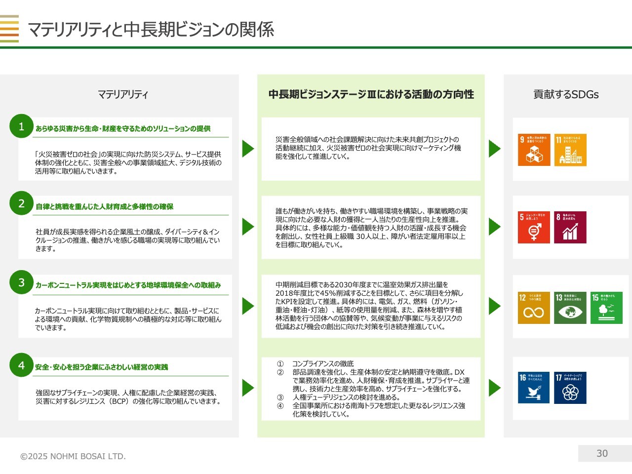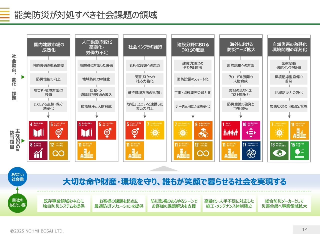 当社が中長期的に対処すべき社会課題については、スライドに記載のとおりだと考えています。「中長期ビジョン2028」の策定にあたっては、防災や安全を切り口としたこれらの社会課題を解決する姿を整理し、「自社のありたい姿」を定義しました。