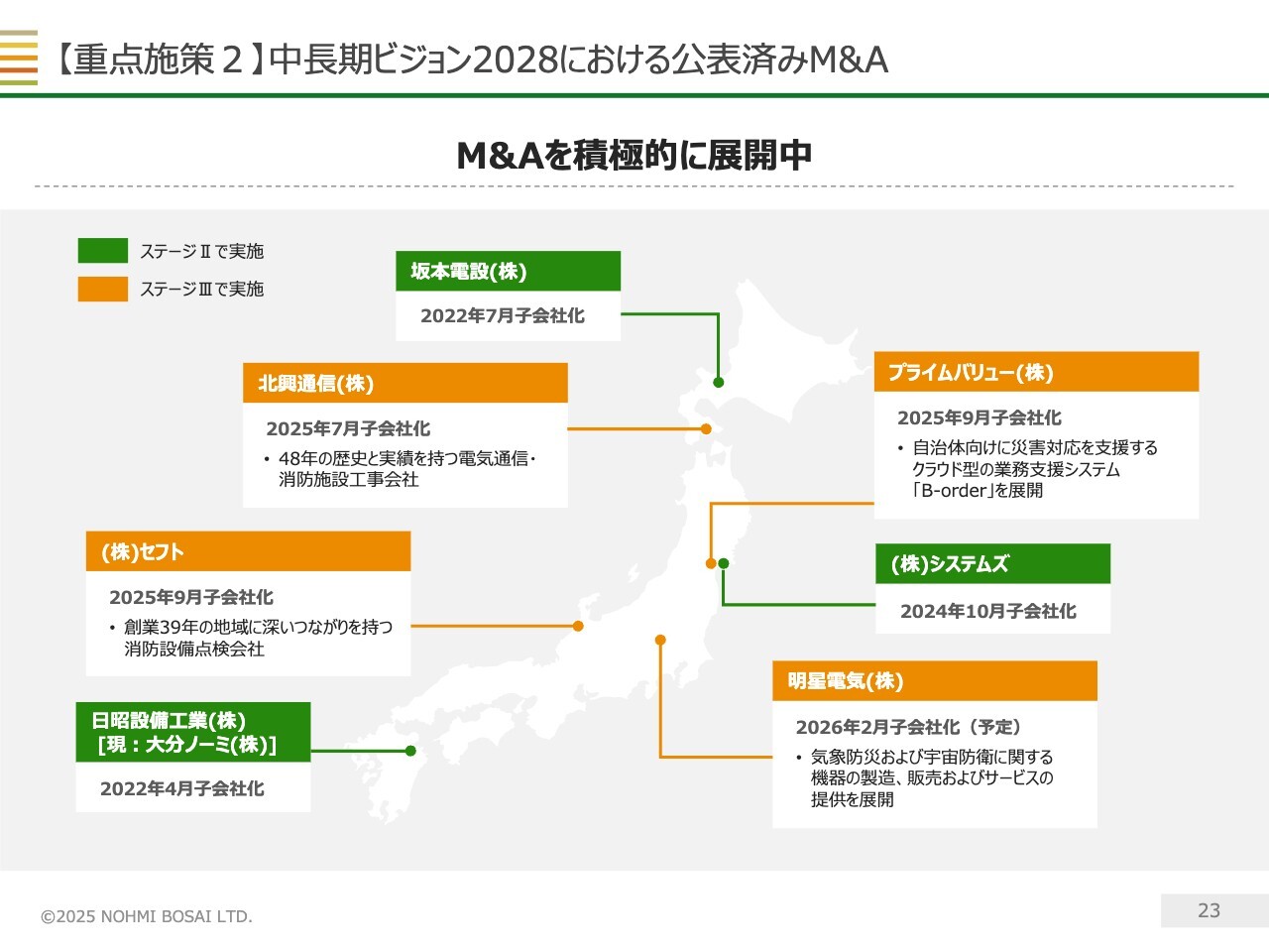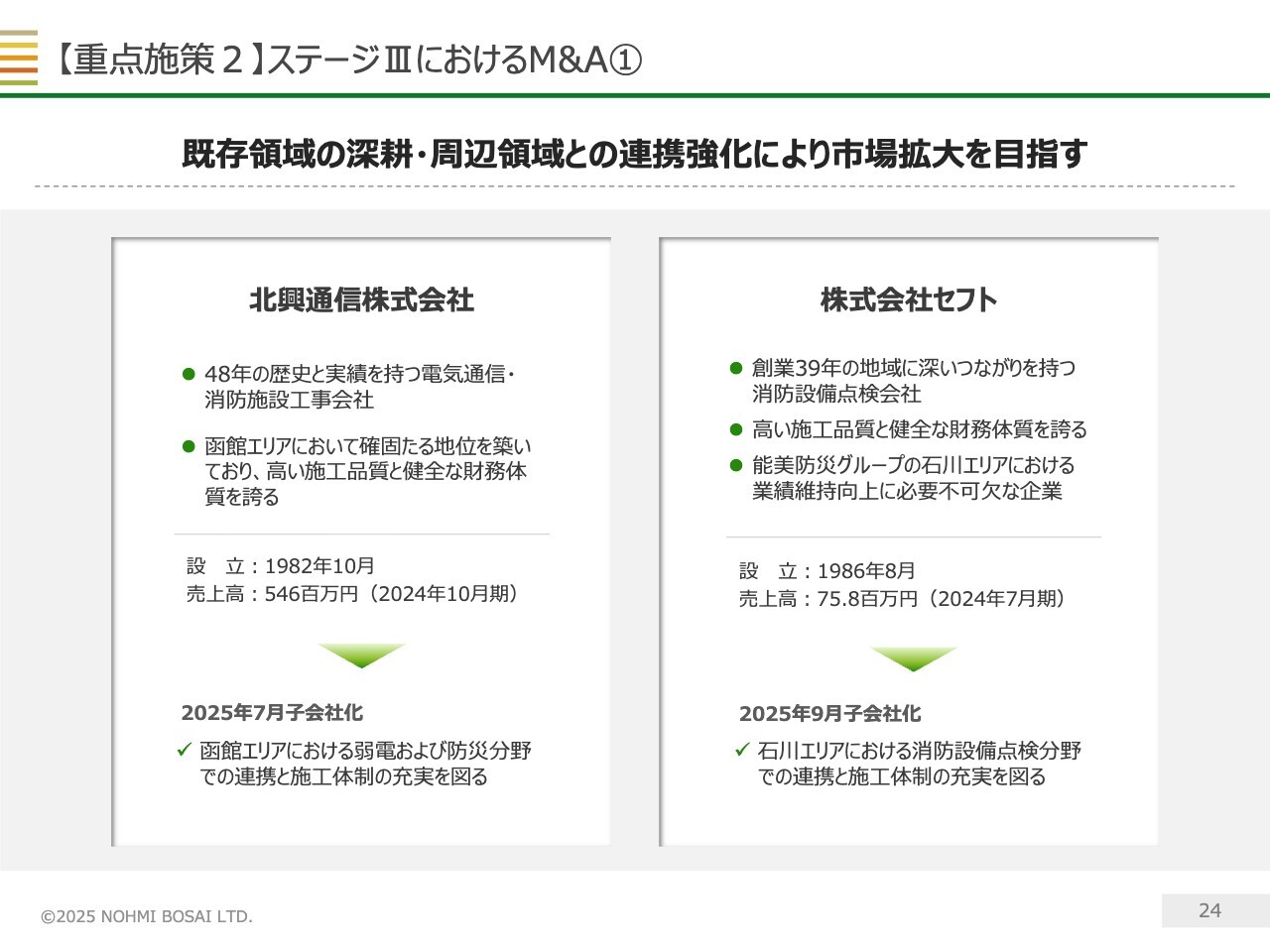 今年7月にグループ入りした北興通信株式会社は、当社の火災報知設備事業と相性の良い弱電工事を手掛ける会社です。弱電工事会社のM&Aは、ステージⅡでも実施してきた実績があります。今回のM&Aを契機に、函館エリアでのシェア拡大を図っていきます。