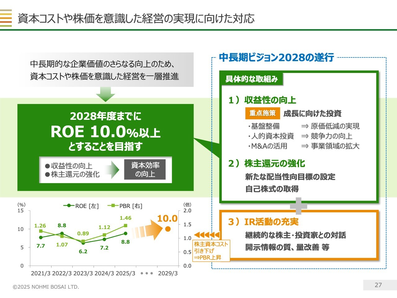 資本効率の観点からKPIとしてROEを掲げて取り組んでいますが、先ほどご説明したとおり、ステージⅢを今期からスタートするにあたって、従来9.0パーセント以上としていた目標を10.0パーセント以上に引き上げています。