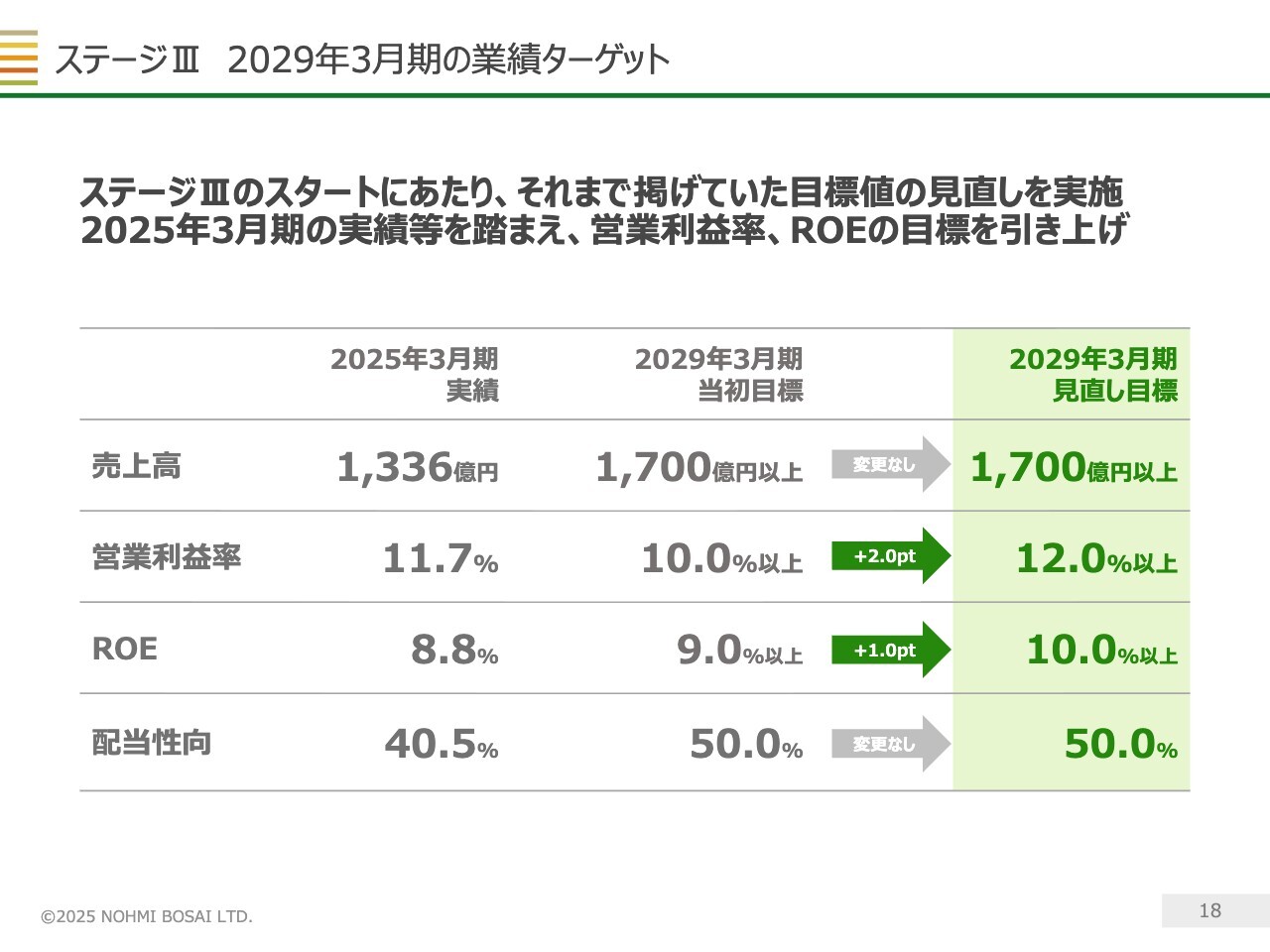 中長期ビジョンにおける具体的な業績ターゲットは、スライドのとおりです。2025年3月期の業績が高水準で目標を達成したことを受け、ステージⅢのスタートに際して、それまで掲げていた2029年3月期の目標数値を引き上げることとしました。