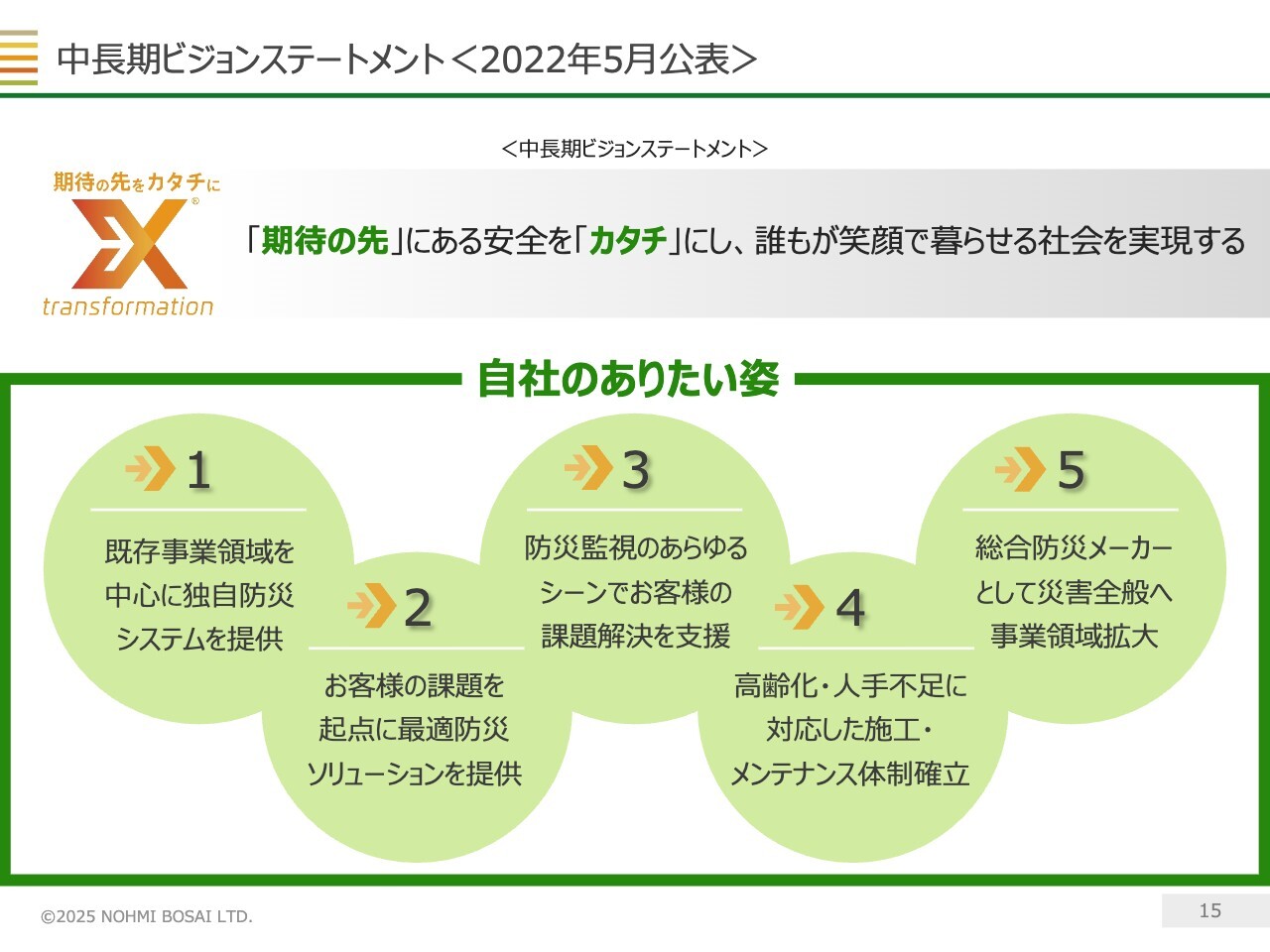 「中長期ビジョン2028」では、「『期待の先』にある安全を『カタチ』にし、誰もが笑顔で暮らせる社会を実現する」をビジョンステートメントとしており、スライドの5つの「ありたい姿」の実現を目指していきます。