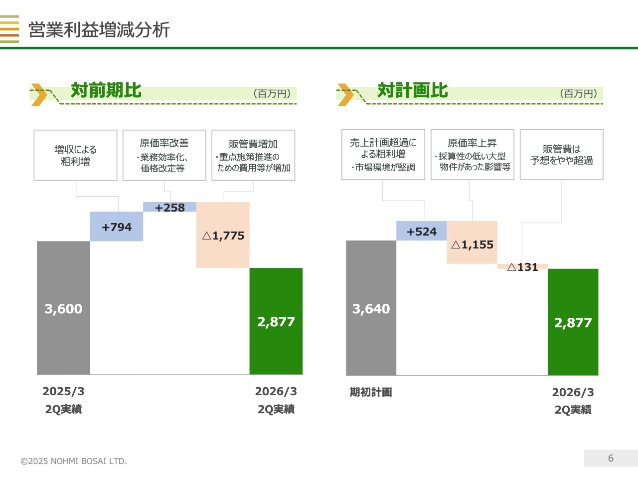 当社の業績は物件の竣工が集中する第4四半期に利益が偏る傾向があるため、第2四半期までの相対的に低い利益水準では、特定の減益要因が目立つ状況です。