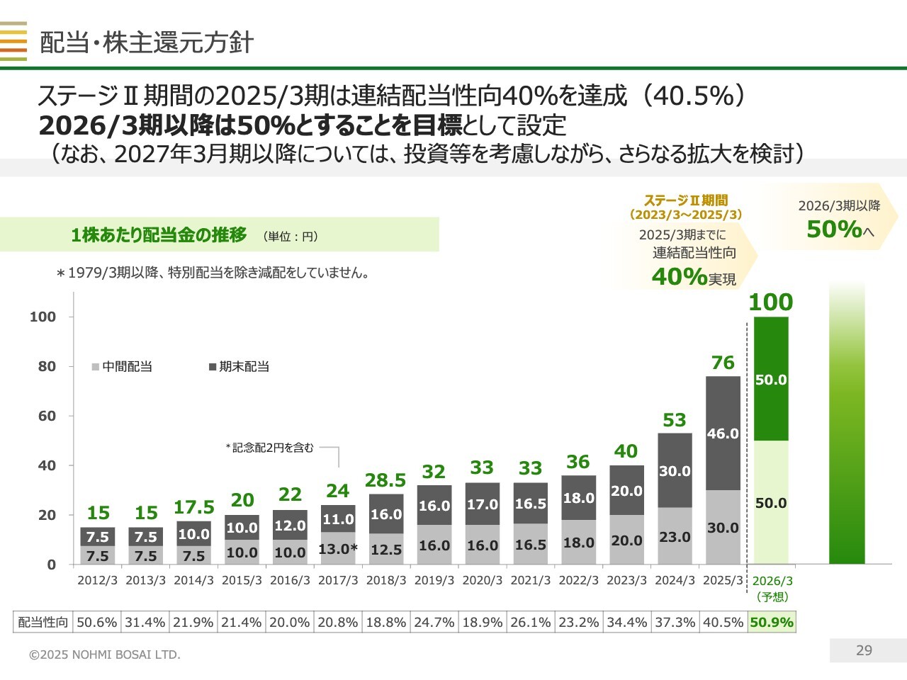 配当・株主還元方針についてです。今期から、配当性向の目標を40パーセントから50パーセントに引き上げました。これにより、今期の1株当たりの配当金は前期から24円増加し、年間100円を予定しています。今後も、高い水準の配当を安定的に継続していきたいと考えています。