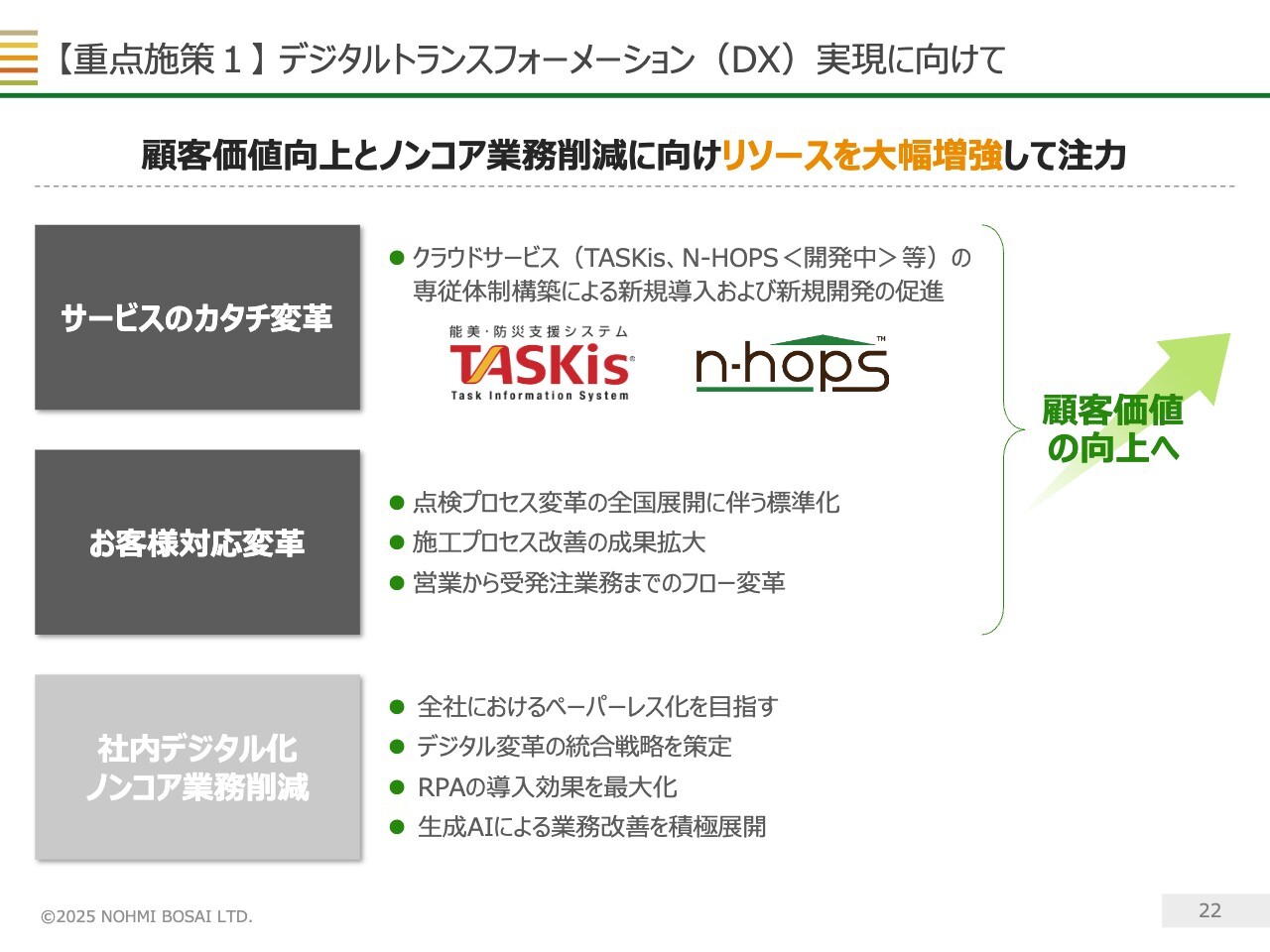 このような取り組みをさらに促進するとともに、点検プロセスや施工プロセスといった「お客さま対応の変革」を進めていきます。また、社内のペーパーレス化の徹底も進める予定です。
