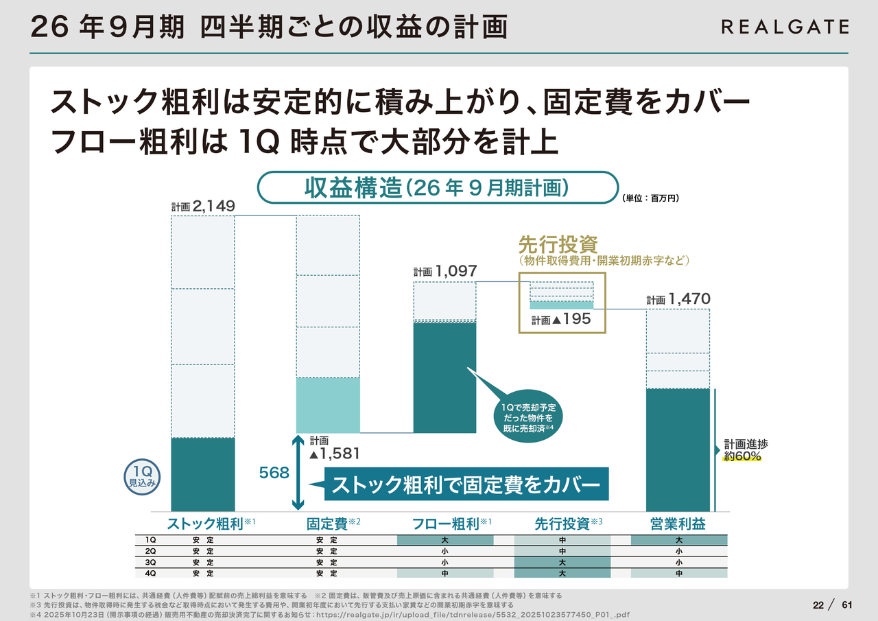 四半期ごとの収益計画です。ストック粗利が安定的に積み上がることで固定費をカバーする一方で、フロー粗利は第1四半期時点で大部分を計上します。