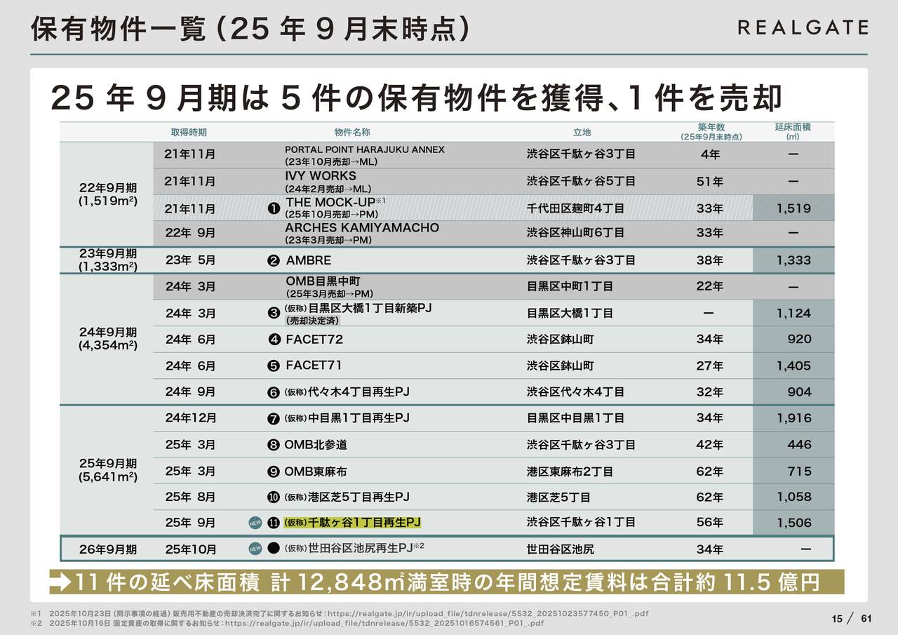 スライドには保有物件の一覧が記載されています。2025年9月期には5物件を保有し、1物件を売却しました。これにより、合計で11物件となっています。