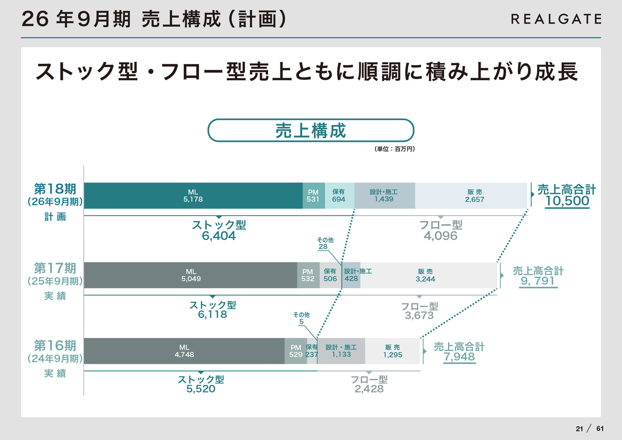 売上構成についてです。ストック型・フロー型ともに順調に積み上がる予定です。