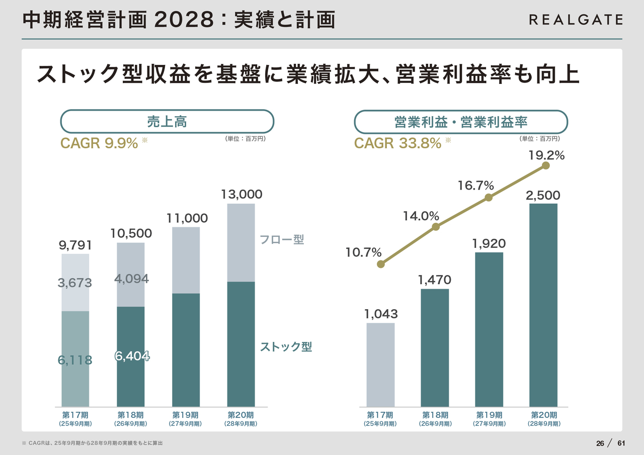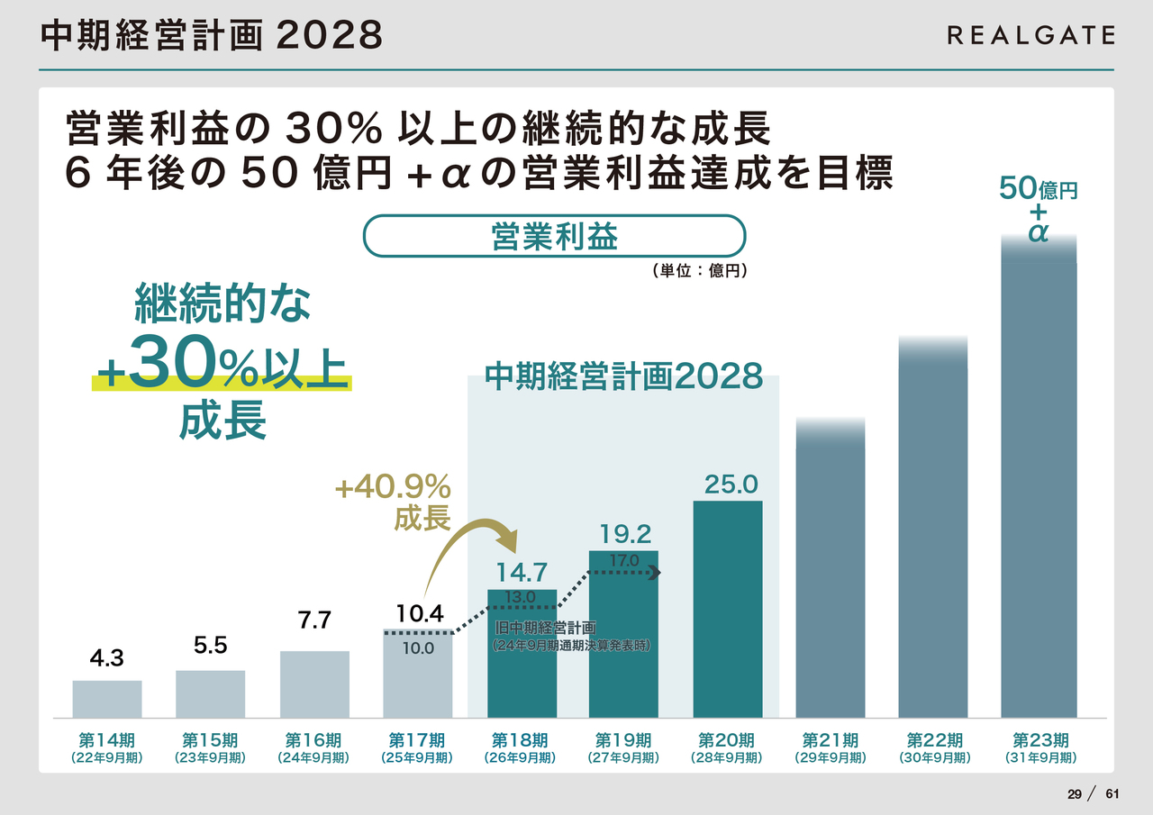 第18期の営業利益については、前期比40パーセント以上の成長を目指します。旧中期経営計画と比較して、第18期(2026年9月期)から第20期(2028年9月期)の中期経営計画2028では、大幅に数字を伸ばしています。第20期(2028年9月期)には営業利益25億円を達成し、第23期(2031年9月期)で予定している営業利益50億円の達成を早めたいと考えています。