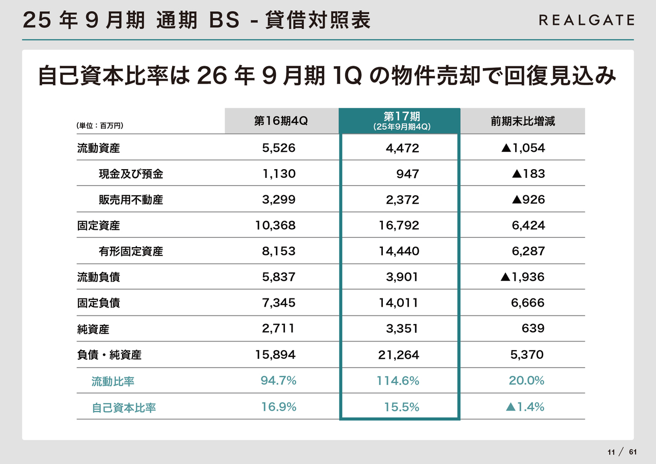 スライドは通期のBSです。自己資本比率は現在15.5パーセントですが、2026年9月期第1四半期に物件の売却が完了するため、回復すると見込んでいます。