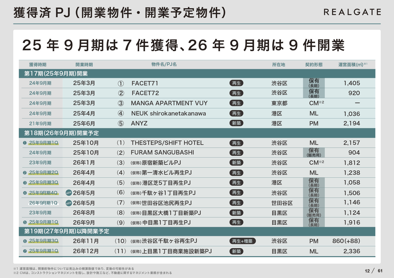 スライドは獲得済みプロジェクトについてです。2025年9月期には7件を獲得し、2026年9月期には9件が開業と、開業物件が非常に増加しています。