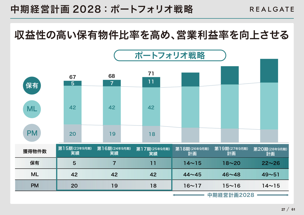 ポートフォリオ戦略についてです。収益性の高い保有物件の比率を高めることで、営業利益率を向上させます。