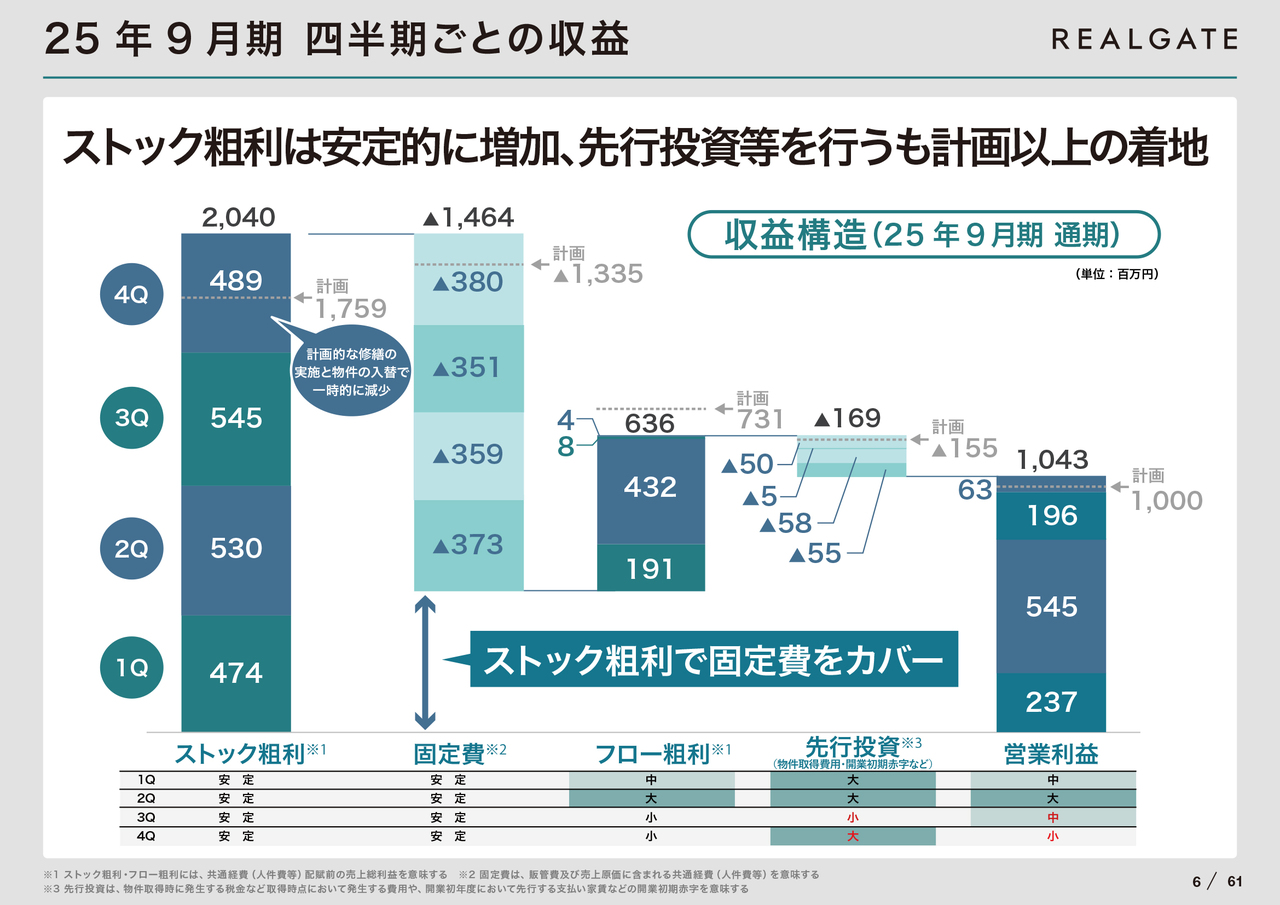 2025年9月期の四半期ごとの収益についてです。ストック粗利が順調に積み上がり、固定費や先行投資が増えているものの、計画以上の営業利益を達成しました。