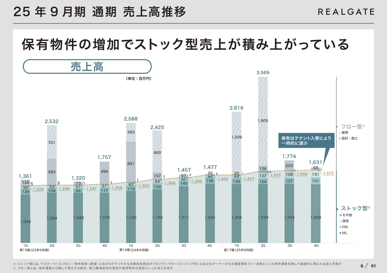 スライドは、通期の売上高推移を示しています。保有物件の増加により、ストック型売上が順調に積み上がっていることがわかります。