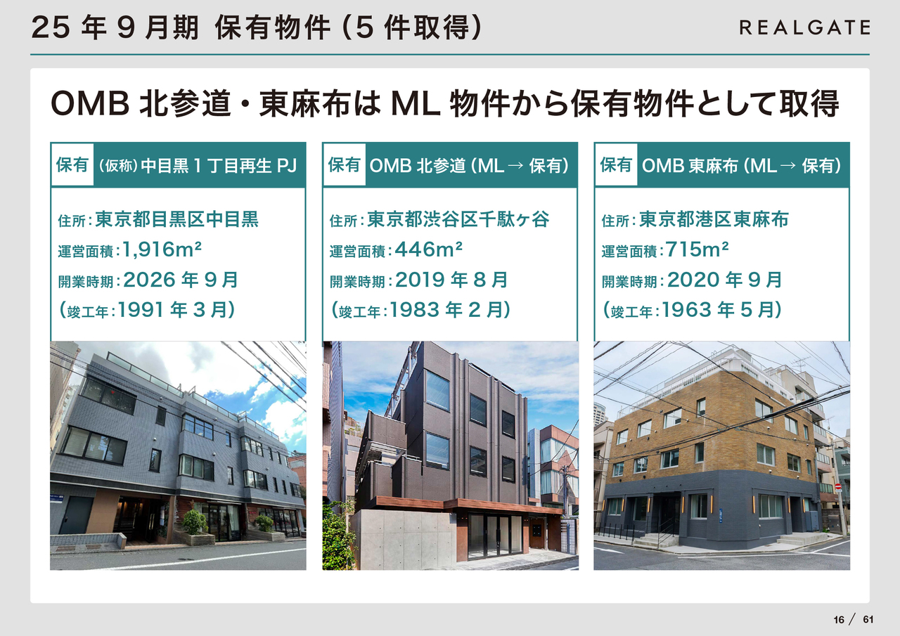 こちらは保有する5物件です。「OMB KITASANDO(OMB北参道)」「OMB HIGASHIAZABU(OMB東麻布)」はマスターリースから保有へ切り替えた物件です。