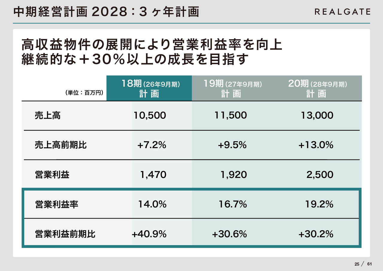 「中期経営計画2028」の3ヶ年計画です。高収益物件の展開によって、営業利益率を年々向上させていきます。