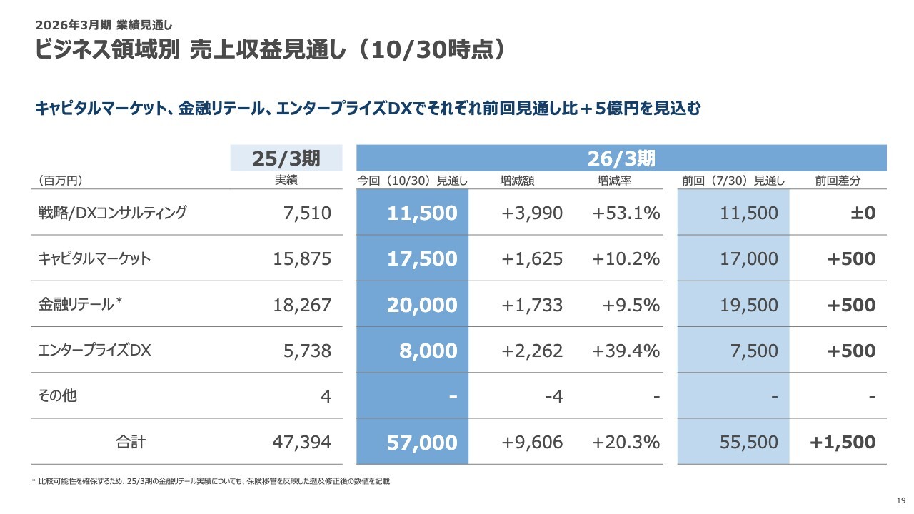 ビジネス領域別で見ると、システムインテグレーションによる売上増加15億円分が、キャピタルマーケット、金融リテール、エンタープライズDXの3領域において、それぞれ5億円ずつ上方修正される見込みです。