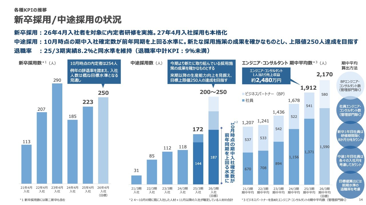 また、生産効率を向上させる上で重要なエンジニア・コンサルタントの総数は、社員エンジニアとビジネスパートナーとして常駐いただいているBPエンジニアをすべて含め、今期は期中平均で約2,170名となる見込みです。この予測は、期初計画から変更はありません。
