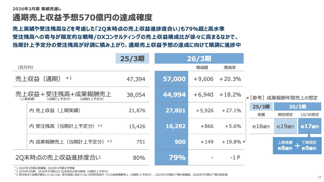 570億円の目標に対して現時点で見えているのは、売上収益の上期分と受注残高の当期計上予定分、さらにこの受注残高には含まれていない成功報酬売上を合わせた約450億円です。つまり、570億円に対して約79パーセントの進捗状況ということです。