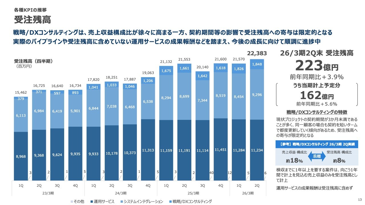 一方、現時点での受注残高におけるクロスピアのコンサルティング構成比は約8パーセントとなっており、契約期間が短いため、受注残高に積み上がりにくい傾向があります。今後、戦略/DXコンサルティングの売上比率がさらに大きくなるにつれて、この傾向はより顕著になると想定していますので、留意していただければと思います。