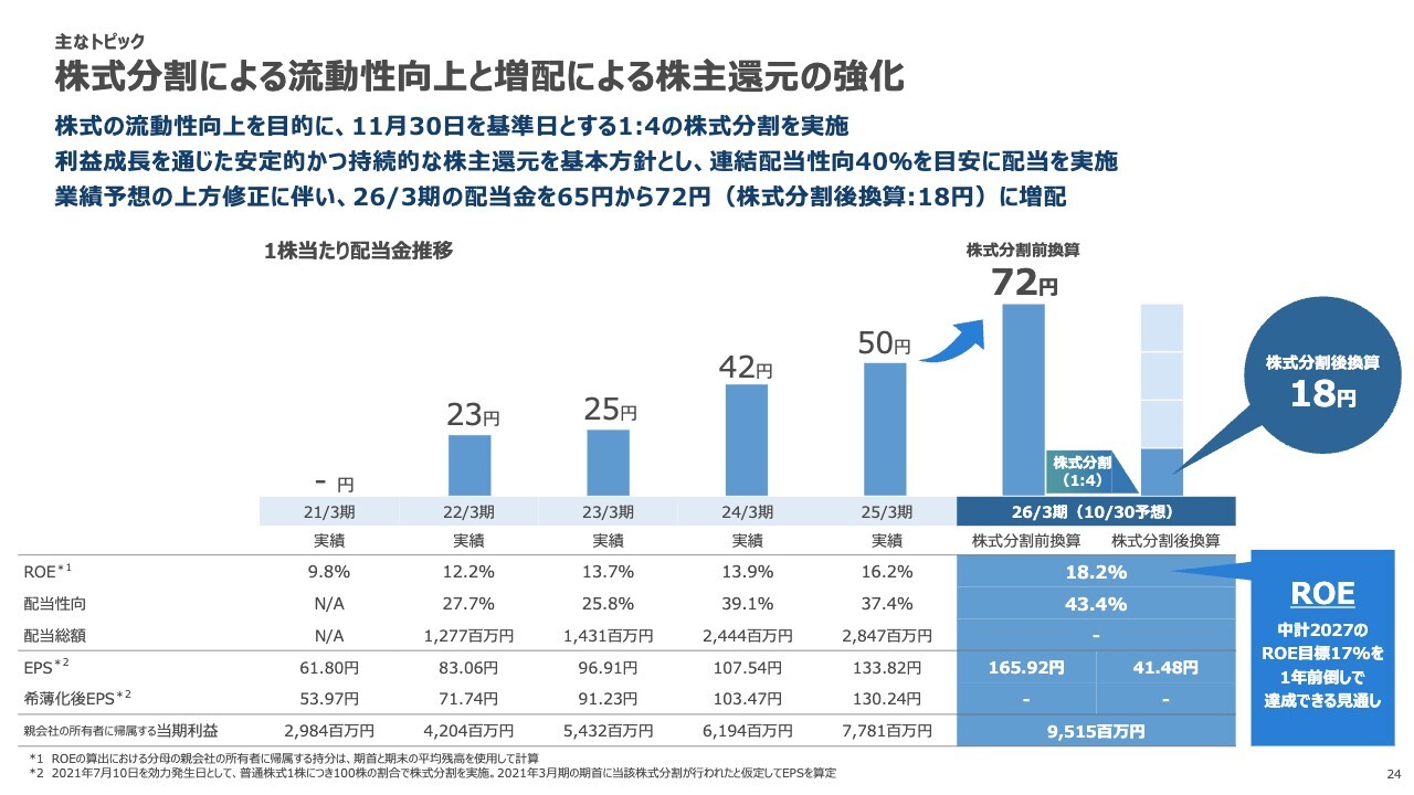 今回、営業利益の目標値を大幅に上方修正したことに伴い、配当金も65円から72円へ増配します。なお、4分割後の1株当たり配当金は18円となる予定です。