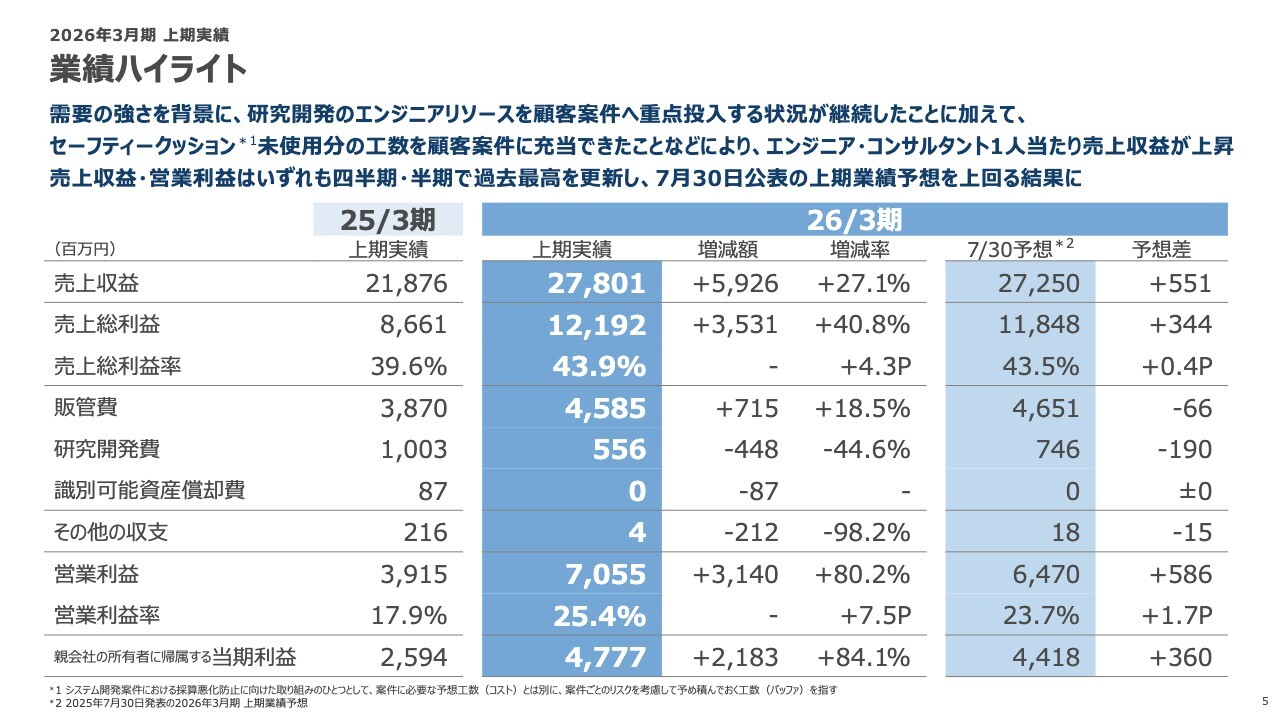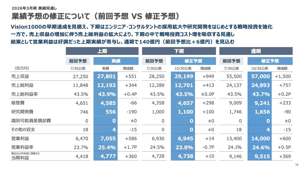 Q:今回の業績予想修正の前提について確認したいです。上期は研究開発予算の一部が未消化となり、当該エンジニアリソースを顧客案件へ振り向けた結果、売上増加に繋がったと認識しています。一方で下期は、今回の計画変更により、売上増加とともに研究開発費